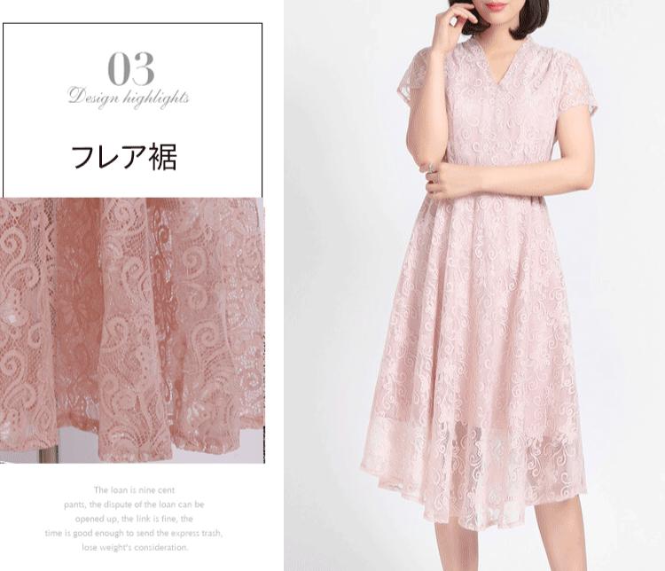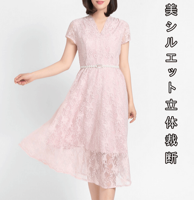 【レースワンピース】膝丈 高級感 Vネック パールベルト 披露宴 ニ次会