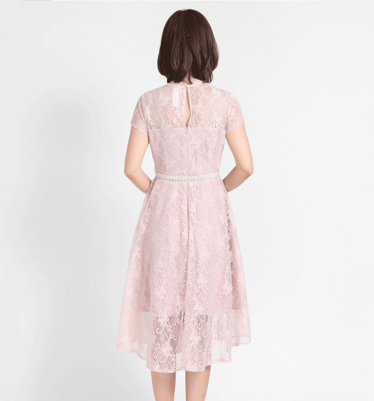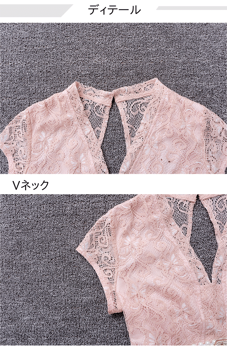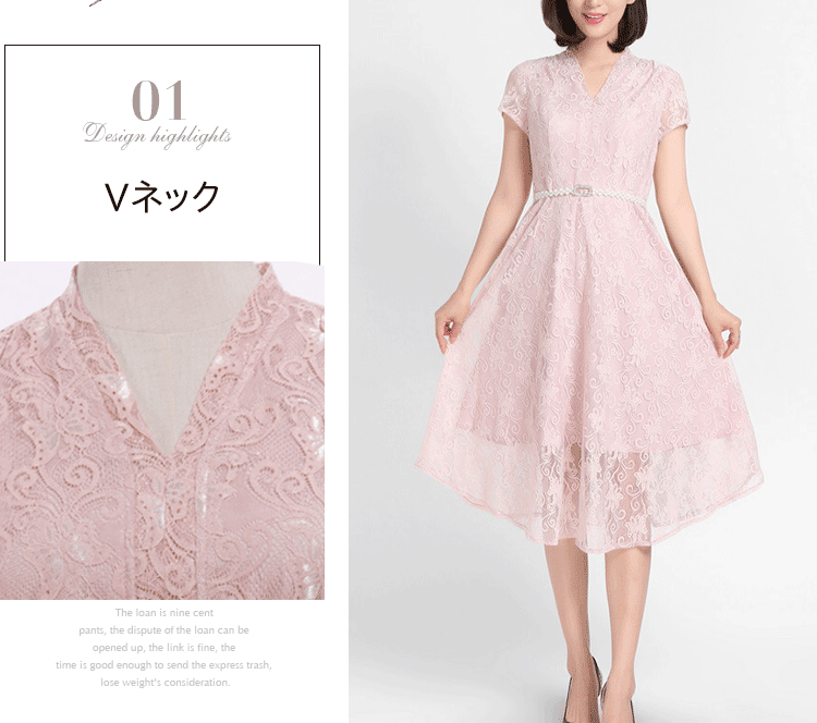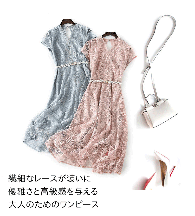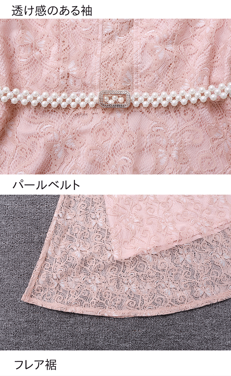 【レースワンピース】膝丈 高級感 Vネック パールベルト 披露宴 ニ次会